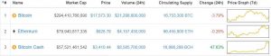 But while bitcoin and ethereum struggled to tread water, the third-largest cryptocurrency raced to an all-time high. Spurred by bullishness related to its listing on Coinbase, the bitcoin cash price rose as high as $3,800 in the global market before settling down to a present value of $3,410. This represents a 24-hour increase of 48 percent and gives bitcoin cash a market cap of $57.5 billion.