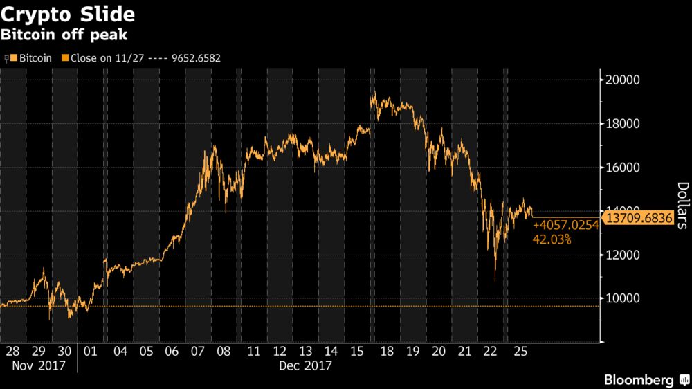Bitcoin fell 3.8 percent from Friday’s close to $13,703 at 4:08 p.m. Monday in New York, when most U.S. markets were closed for Christmas. That’s 30 percent off its record high of $19,511, based on prices compiled by Bloomberg.