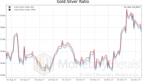 In this graph, we show both bid and offer prices for the gold-silver ratio. If you were to sell gold on the bid and buy silver at the ask, that is the lower bid price. Conversely, if you sold silver on the bid and bought gold at the offer, that is the higher offer price.
