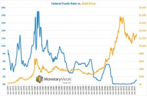 We have written a number of pieces on the topic of interest rates and the gold price (bottom line: there is no clear correlation). Let’s not forget that the gold price was rising in the 1970’s while the rate was rising, and again in the 2000’s while it was falling. Here is a graph of the Fed Funds Rate and the gold price from 1970.