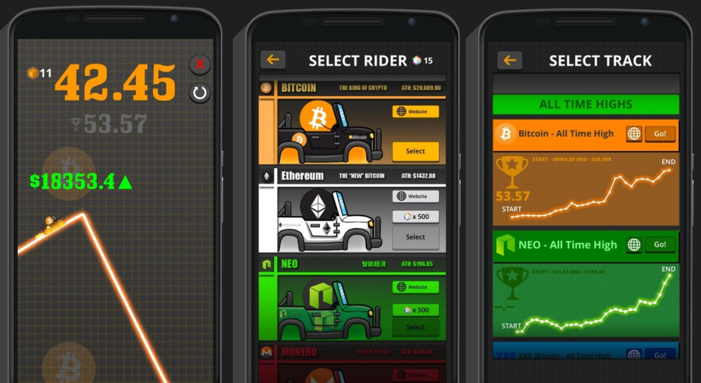 You select your car, then pick a chart to ride — most are a ride from a coin’s humble start to its highest value. But there’s a mountain-like “total market cap” track, a “drag race” where you need to clear a valuation gap and one that must be depressing for BTC holders: a bumpy downhill ride from $20K to $7,850. New tracks should appear in time, as new cryptocurrencies rise and fall.