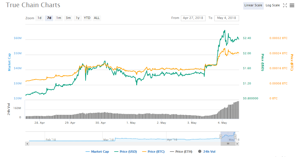 On Friday, Apr 27th, TRUE token was commanding an average price of $0.9. Over the past one week, it has grown to reach a high of $2.67 on Thursday, May 3rd. The closing price on Thursday was $2.3 and it had reached a high of $2.4 in the morning hours of Friday. This represented a growth of 43%. The volumes traded have climbed from $49 million on Apr 27th to reach a high of $302 on Friday morning. The market cap has also increased from $21 million to $61 million in a span of one week. The growth of the crypto during the week was 165%.