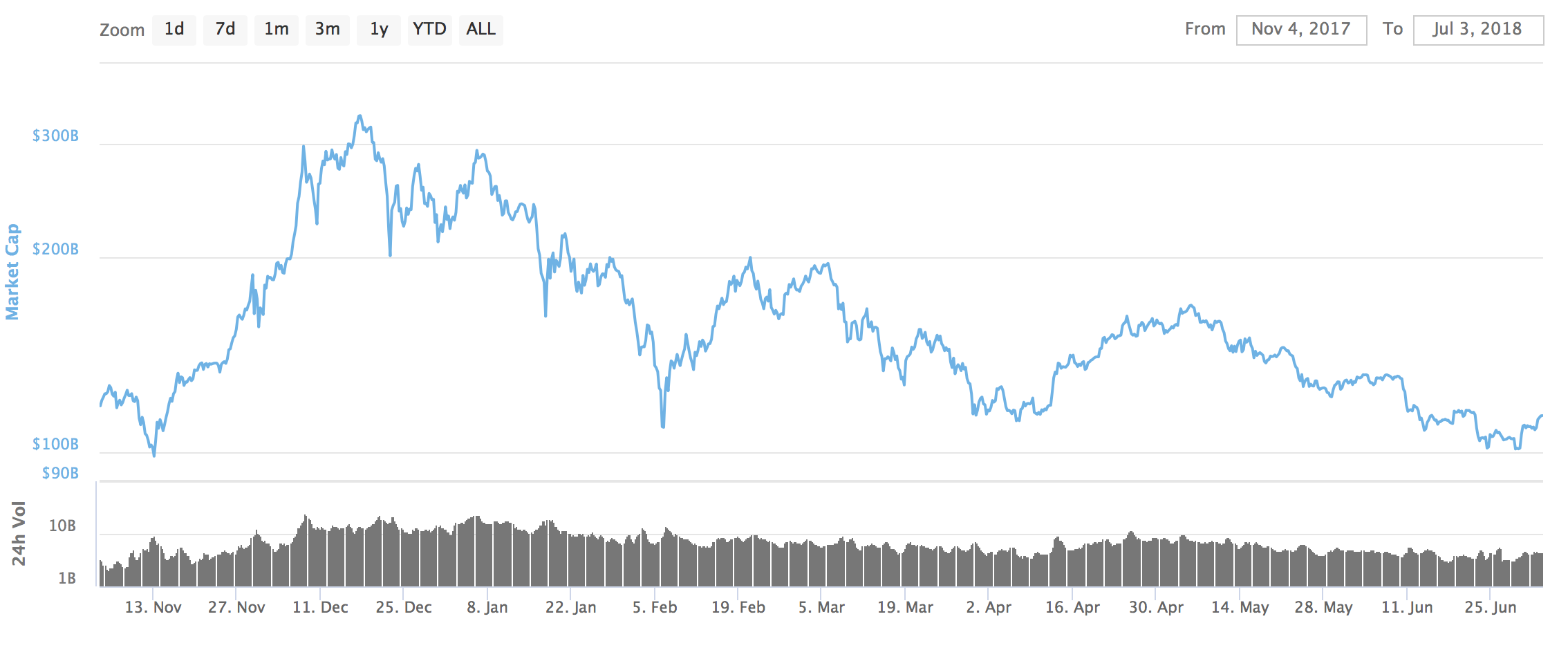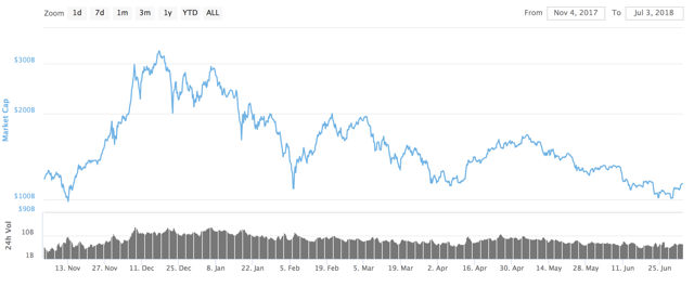 Bitcoin’s (BTC-USD) bear market has been raging for more than 6 months now. Since the hyper-volatile digital asset topped out at almost $20K late last year, significant carnage has occurred in digital asset arena. Bitcoin alone has shed well over $200 billion in market value since the declines began, but the entire crypto currency complex has cratered by an astonishing $550 billionsince its top was reached early in the year.