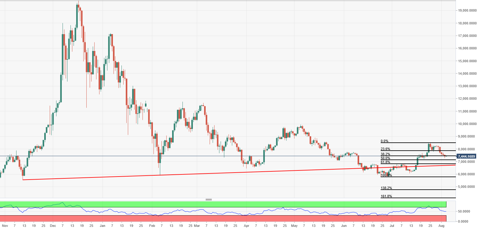 Support is placed before that is around $7,140 mark, which is a 50 percent fibonacci retracement of its recent rise from the low hit in June. Resistance is placed just around the current price – $7,455.