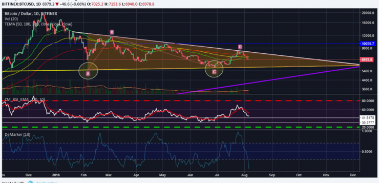The resistance that Bitcoin (BTC) ran into back on July 27 as can be seen above on the 4H chart for BTC/USD was already expected as pointed to in one of my previous analyses. This was a strong impediment to further upside as it was a confluence of time axis and price axis resistances. While many were calling for a climb to $10,000 from there, we called for continuation of the correction. The price action post July 27 is a mirror image of the price action before that. It is in the best interest of Bitcoin (BTC) that its price tests the $5,800 level again to put in a bottom, so that a new cycle can begin.