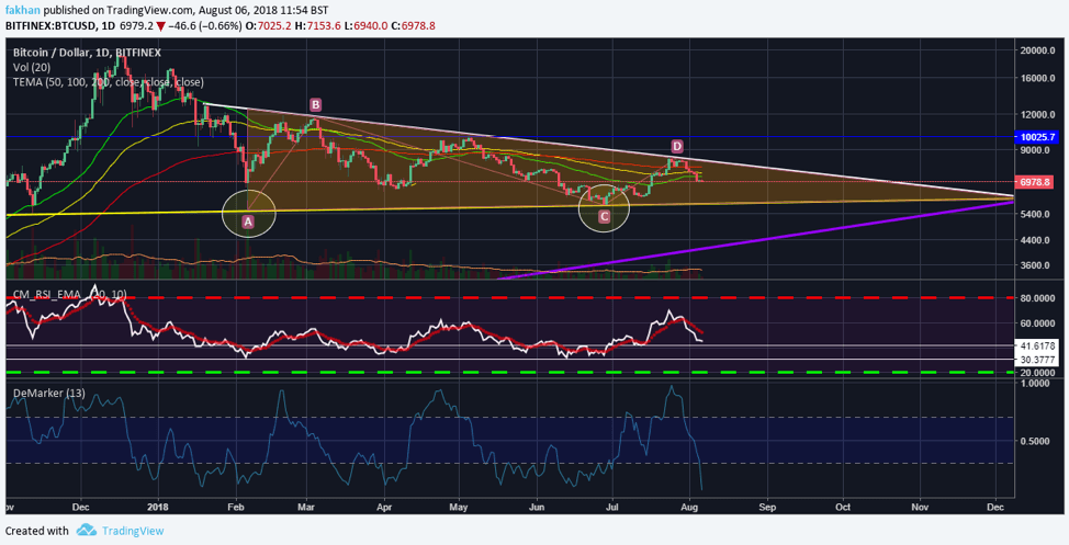 However, despite the fact that Bitcoin (BTC)’s RSI is nearing oversold levels and the DeMarker indicator is signaling a near term reversal, the price has failed to find a bottom so far. The price started trading in a triangle since January this year and has yet to break above or below it. Bitcoin (BTC) has managed to touch the lower limit of this triangle at $5,800 two times now. There is no doubt as to whether or not it will touch the lower limit of this triangle for the third time. The question though is whether it will put in a bottom to begin a trend reversal or will it fall lower to enter into a long term bear market?
