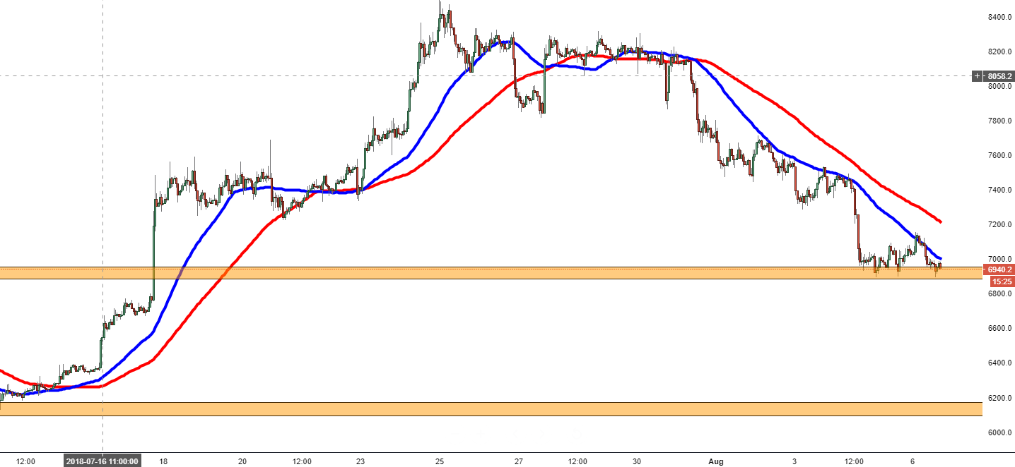 Technically, BTC/USD is currently dipping in and out of near-term support, tracking from $6900-6800, a breach can see a fast fall to around $6100, where the next demand zone is seen. Given the number of times this has been tested, it makes it liable.