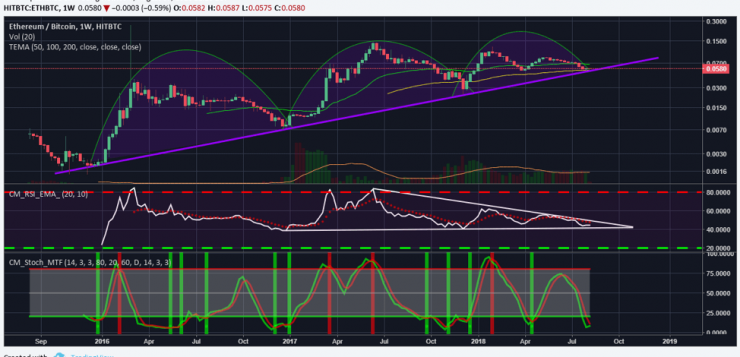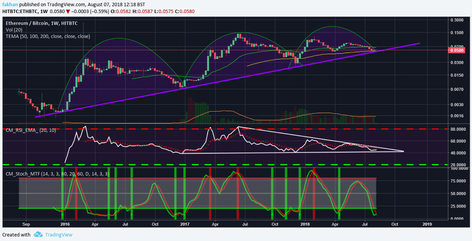 Ethereum (ETH) seems to have found a bottom against Bitcoin (BTC) according to the ETH/BTC weekly chart above. The price action has so far respected the long term trend line since before 2016. Ethereum (ETH) has now completed three cycles against Bitcoin (BTC). The first cycle was the longest and third the shortest. It is likely that the cycle that follows after this might be a big one and could extend all the way to Q1 of 2019. RSI looks favorable for a run up as it is likely to soon break out of the triangle it is trading it. Stochastic conditions for ETH/BTC also look favorable as currently oversold conditions are starting to shift in favor of the bulls.