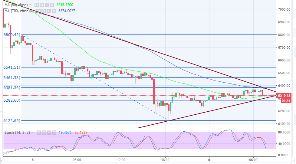 There is a contracting triangle forming on the short-term 15-minutes chart which could lead to a breakthrough in the near-term. A break above the 100 simple moving average resistance at $6,375.45 will allow for further upside movement above the 23.6% Fibo resistance. $6,400 is also in sight and within reach, if the buyers can maintain the momentum above the trendline. However, BTC/USD could break down more if the lower trendline support at $6,300 is broken. Bitcoin is still in danger of dropping towards the stronger support at $6,200 while $6,000 is within reach unless the buyers maintain the price above $6,300.