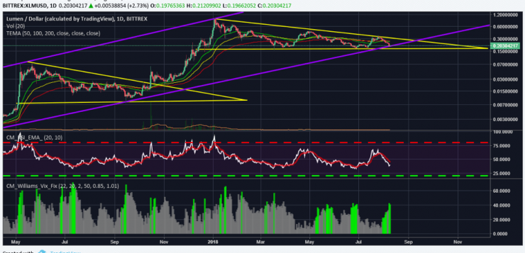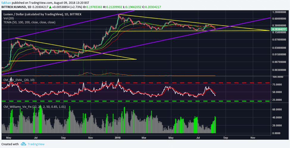Stellar (XLM) is at the same point it was back in October, just before a massive rally. The daily chart above for XLM/USD shows that the price of Stellar (XLM) has now touched the support line. RSI and Vix indicators for Stellar (XLM) show that the price has either reached a bottom or is very close to reaching it. Stellar Lumens (XLM)’s RSI is at a level where a big rally from here on out seems favorable. The price is currently trading just above 20 cents, down from 33 cents in late July. The price action appears bullish but Stellar (XLM) has to remain above the support line in order to begin a new cycle at this point.