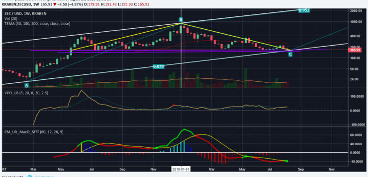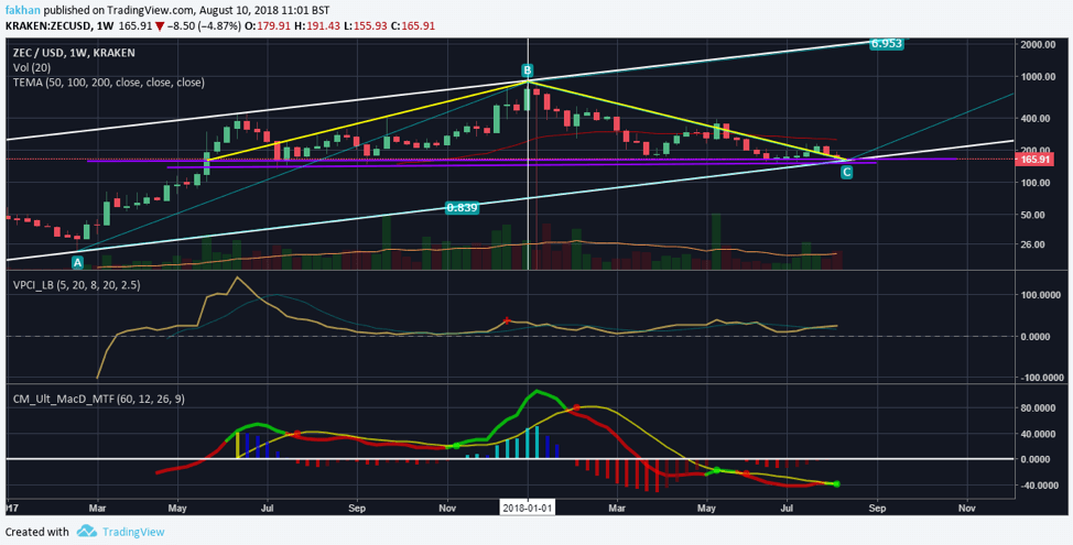 ZCash (ZEC) is a popular source code fork of Bitcoin (BTC), just like Litecoin (LTC). The purpose of its creation was to address privacy issues that users of Bitcoin (BTC) faced and also to curb centralization with its Equihash based proof of work model. As the weekly chart above for ZEC/USD shows, ZCash (ZEC) had a good run in early 2017 and did a good job at preserving its gains after the first ATH was reached in June. The price continued to climb higher in late 2017 and reached an ATH of $1,000 in January.