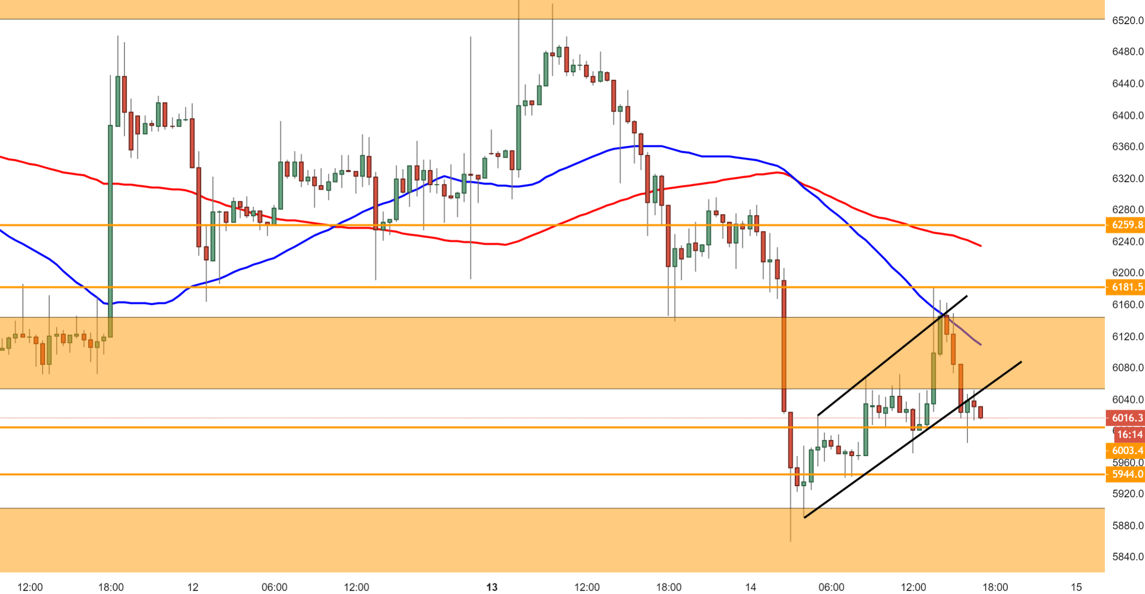 Technically, BTC/USD is vulnerable to some further selling pressure, given the breach of the rising channel. A test of the lows printed in Asian is likely to come into play, seen at $5858.6, which could invite a very fast drop down to $5500 if breached. The demand zone tracks from $5900-800. Resistance is tough from $6050-180.