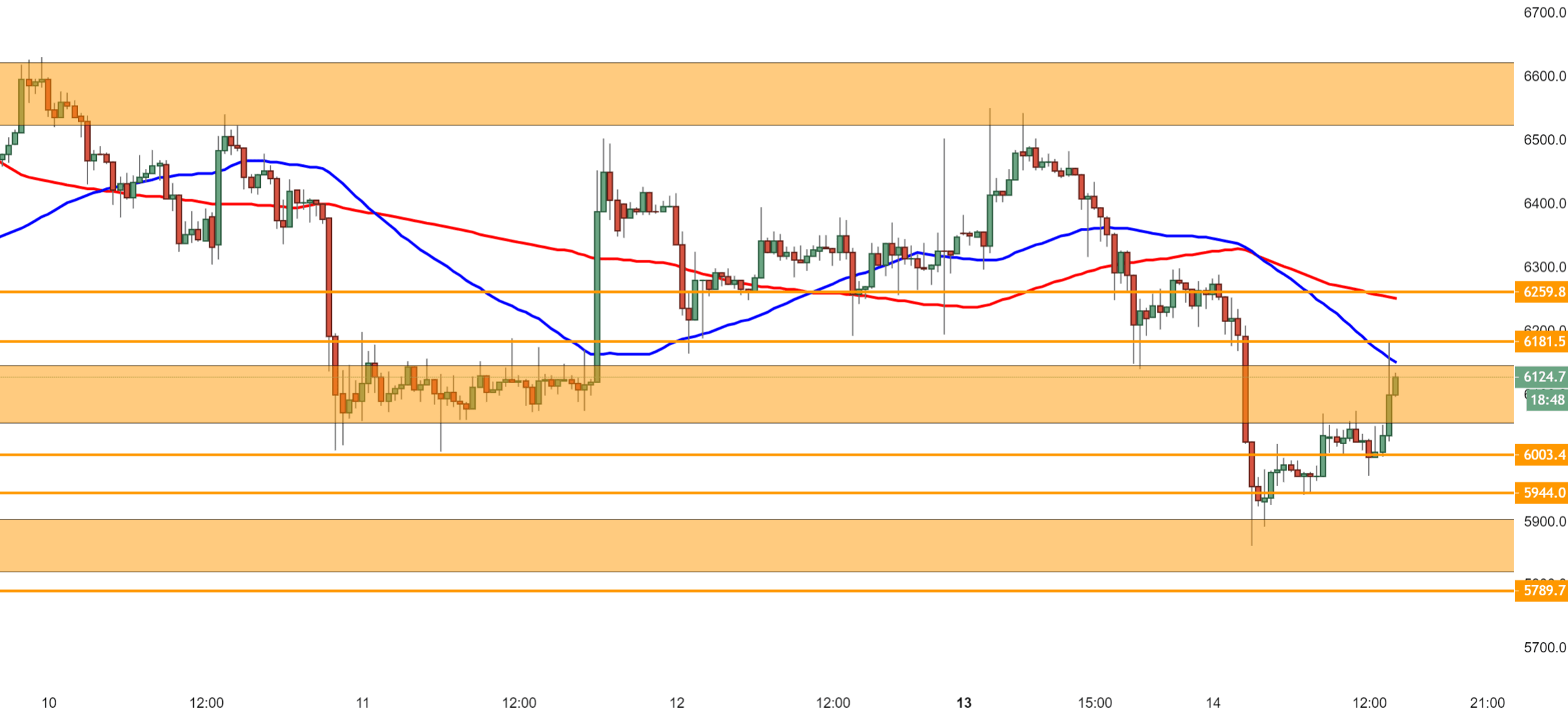 - BTC/USD has been allowed a small pullback from the overnight lows, catching support in the demand zone, $5900-800.