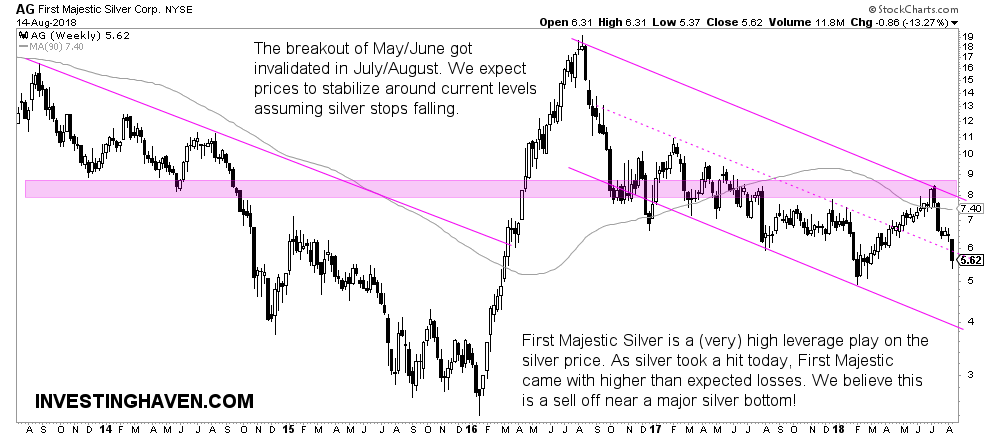 The short term indeed appeared to be unsure. First Majestic was not able to clear overhead resistance, after which it started falling. As silver’s price had a sell off on Monday August 13th, and one specific element in First Majestic’s Silver earnings was disappointing, it resulted in a mega crash of the stock price of First Majestic Silver.