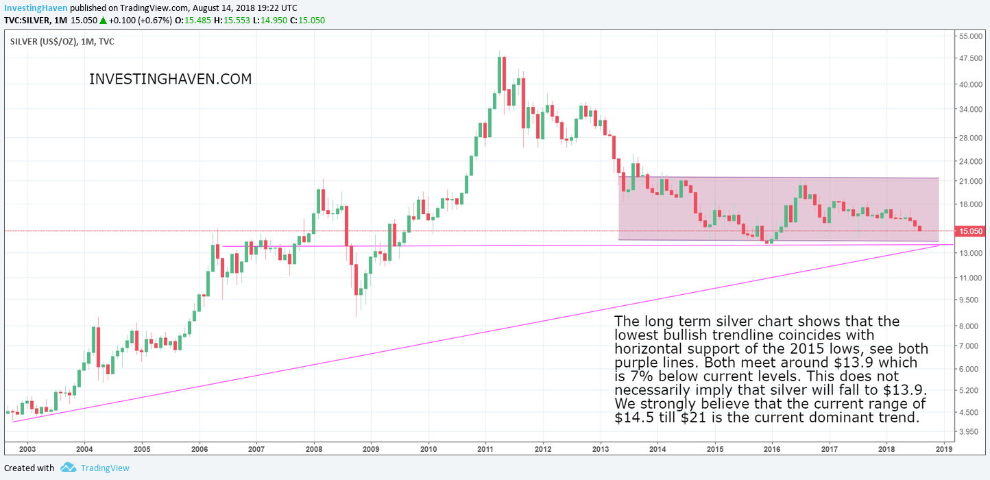 The monthly chart outlined below shows this bullish trendline that started rising with the grand bull market in 2003. Note how this trendline comes in at 13.9 USD later this year. At the same time there is horizontal support around the 2015 lows, also 13.9 USD. We expect silver to be near a major bottom.