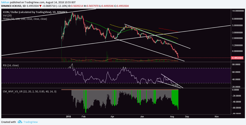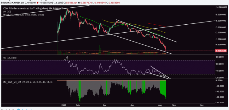 Icon (ICX) is the perfect example of a bleeding cryptocurrency right now. The coin is down an alarming 96% since its all time high of $13.16 in January. The price is currently trading at $0.49 as can be seen on the ICX/USD daily chart above. Icon (ICX) perfectly explains the massive level of capitulation some altcoins had to go through during this recent correction. Over the past 7 months of correction, the price has continued to plummet, for the most part in a free fall against the US Dollar (USD). RSI has continued to trade in oversold territory since the beginning of August but the price has continued to fall further with the rest of the market.