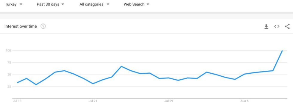 As Bitcoinist reported over the weekend, lira volatility over the past seven days has eclipsed Bitcoin’s, while consumer interest in Bitcoin peaked this month, according to data from Google Trends.