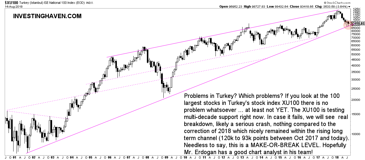 Chart analysis 101 shows that Turkey’ stock market index XU100 representing the top 100 stocks in Turkey has corrected 22% since October 2017. However, it now arrived at a crucial level. As seen on the long term chart below this is multi-decade support.