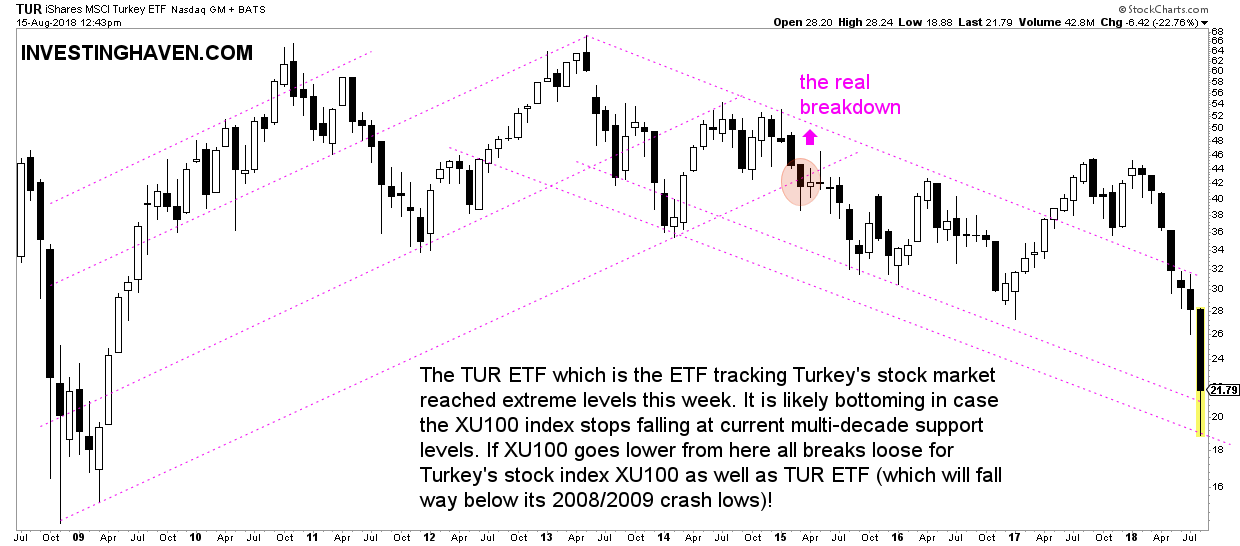 Note that TUR EFT got very close to 2008/2009 crash levels this week. A breakdown in Turkey’s stock market index XU100 will result in a ‘real crash’ in TUR ETF. If XU100 holds up, then we may see a strong recovery in TUR ETF which will bring this instrument to 31 points.