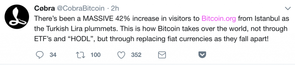 Amidst rumors of Turkish banks ending support for customer accounts holding USD, and President Erdogan desperate to quell the flight to the currency whose issuing nation he blames for the lira’s plight, citizens are left with few places to turn. (Tether is the closest most Turkish traders can get to the US dollar right now.) While predictions of ‘hyperbitcoinization’ in Turkey may be premature, it is evident that cryptocurrencies such as BTC are proving a lifeline in nations whose fiat currency is devaluing by the day.