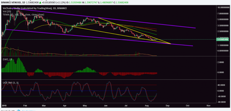 The price of VeChain (VEN) has yet to test the bottom of its descending channel but it already seems to have found support and is now bracing for a breakout. EMA alignment for VET/USD continues to remain bearish as the price struggles to break past the downtrend resistance. Elliot Wave Oscillator for VeChain/US Dollar also shows that the price has undergone the full extent of a correction and is now ready for a breakout at least for the near future. SMI indicator on the above chart also shows that the price has room for upward movement.