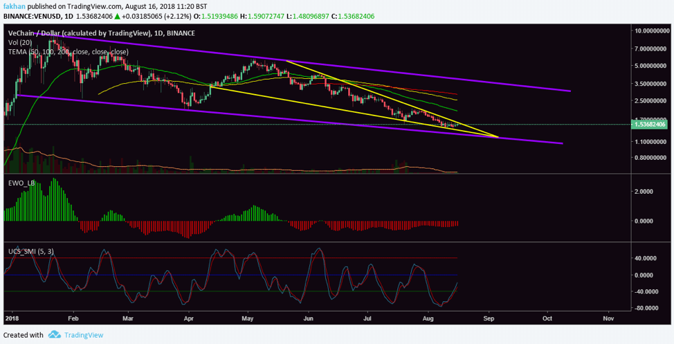 Wave Trend indicator for the chart above shows the price to have settled down for now and capable of making big movements to the upside in the next few weeks. The special stochastic oscillator on the above chart also indicates that VEN/BTC has room to break out of the falling wedge in the days ahead. However, it will likely run into an EMA resistance before it can continue higher.