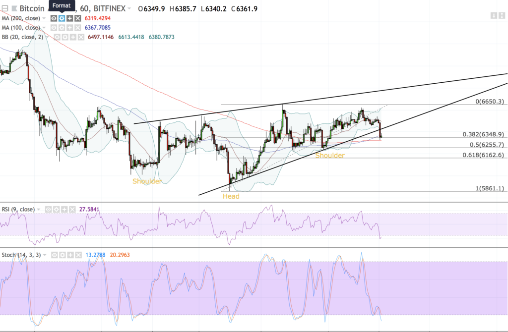 The BTC/USD has broken out of the rising wedge pattern, but its downside is capped by strong bull supports near 6348-fiat and 6255-fiat. As for now, we are close to forming a near-term Head and Shoulder pattern, with the head near 6620-fiat and shoulder near 6255-fiat. The left shoulder of current H&S is also the right shoulder of the inverse H&S, which makes it a crucial level to watch for as the price attempts another downside.