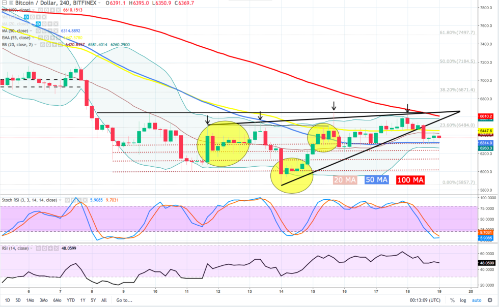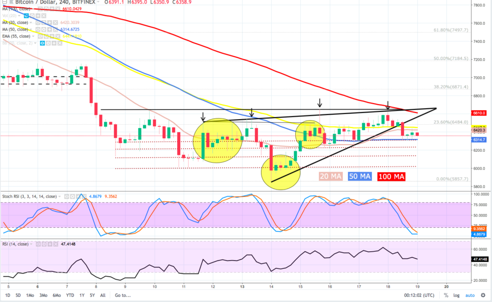 Bitcoin seemed on the verge of a breakout above $6,650 but a failed third attempt, followed by a lack of buying interest has given bears an opportunity to snatch back control and it looks like BTC has dropped a shelf for a bit of sideways trading in the $6,200 – $6,400 range.