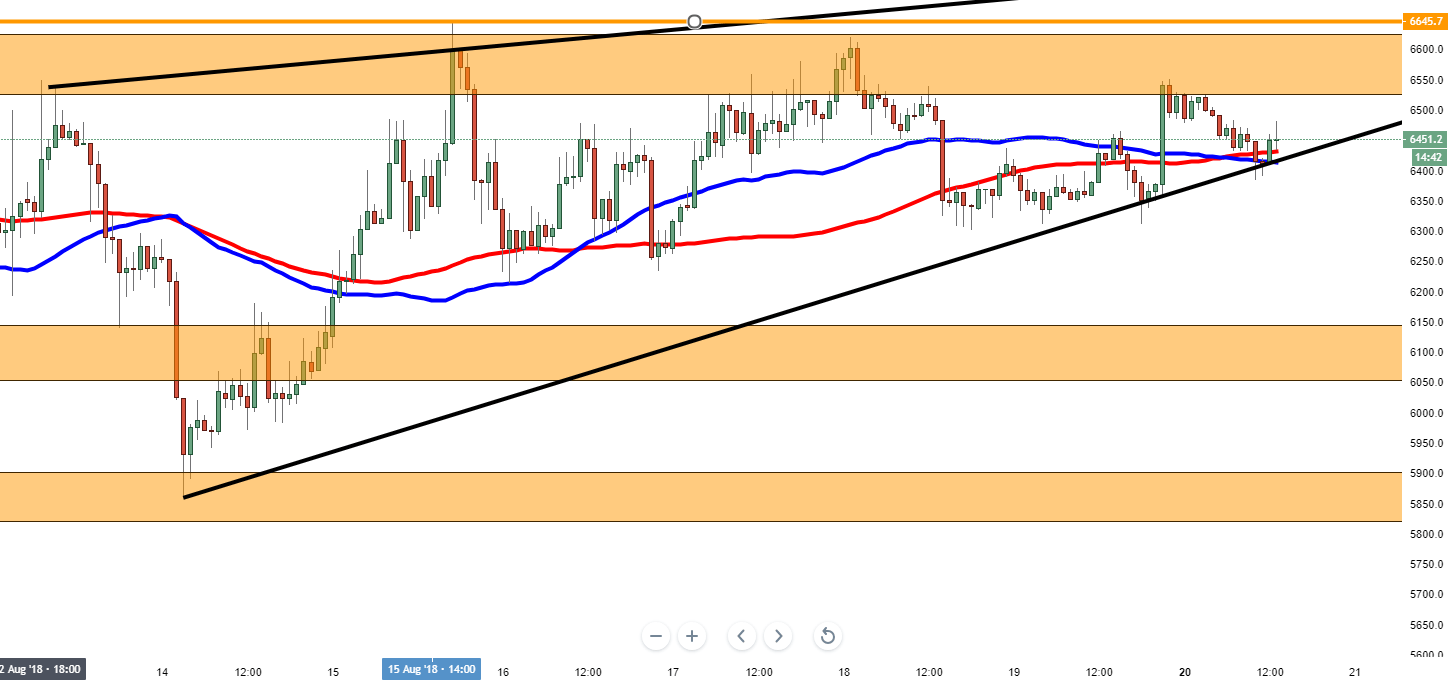 - BTC/USD bulls are currently sharpening their horns, in an attempt to breakdown $6500-600 area.