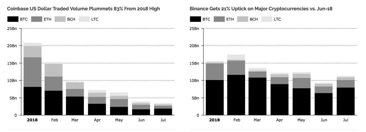 The latest issue of monitoring resource Diar’s newsletter presents startling data from some of the best-known cryptocurrency trading platforms with Coinbase’s overall volume plummeting 83 percent in the seven months to July.