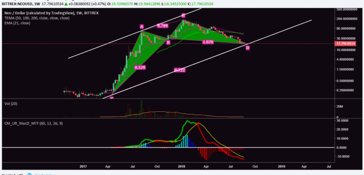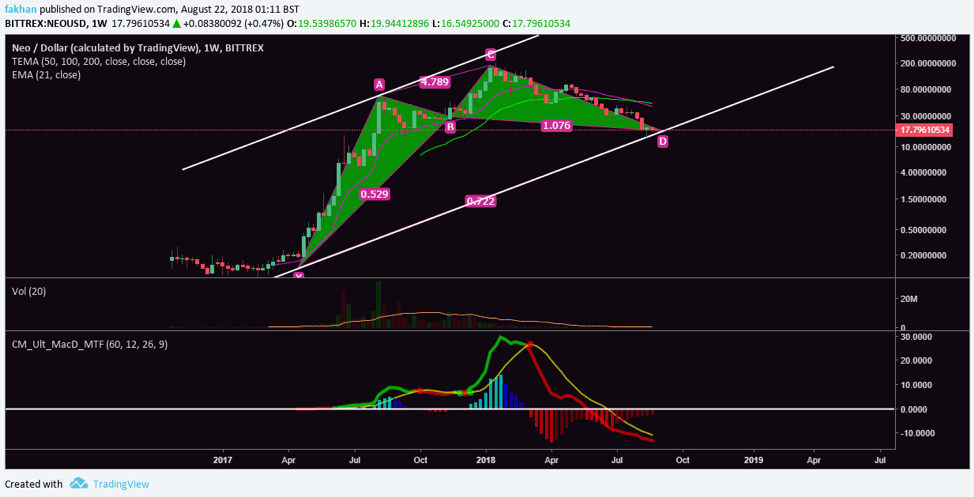 NEO (NEO) has just completed the full extent of its correction as can be seen on the NEO/USD weekly chart above. The price is currently at the lower end of the ascending channel and has completed a big bullish cypher. The bullish cypher on the above chart was completed between April 2017 and August 2018. That is a big sigh of relief for a coin that is now down 91% from its all time high. MACD profile for the NEO/USD chart above also seems to have run its course and is now preparing for a trend reversal as the gap between the red and yellow line narrows. NEO (NEO) also seems to have now completed its capitulation phase which began when the 21 EMA broke below the 50 EMA.
