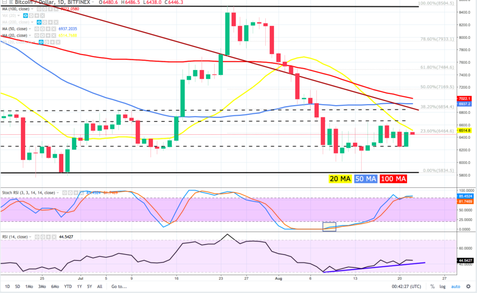 BTC clearly wants to climb above $6,500 and the RSI and Stoch on the 1-hour, 4-hour and daily chart are supportive of this — but buyers just aren’t feeling confident enough to help push BTC to form a triple top at $6,645 and move on to $6,800.