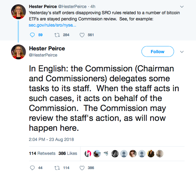 In fact, SEC Commissioner Hester Peirce tweeted, “Yesterday’s staff orders disapproving SRO rules related to a number of bitcoin ETFs are stayed pending Commission review.” and She then followed with an additional tweet explaining the previous one in plain English.