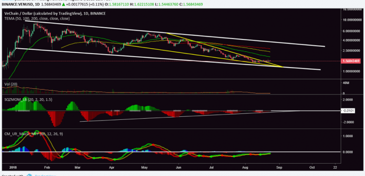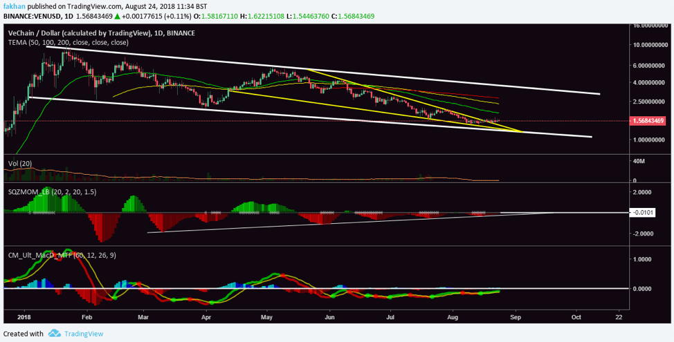 VeChain (VEN) has just broken out of a falling wedge against the US Dollar as can be seen on the VEN/USD daily chat above. The price has yet to test the bottom of the descending channel it has been trading in since the beginning of the year. However, technical indicators at this point indicate a rally from these levels towards the top of the descending channel. Squeeze momentum indicator on the above chart shows a declining bearish momentum since March. As of now, the bears no longer seem to be in control as the price has broken out of a falling wedge resistance.
