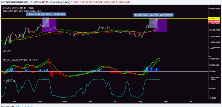 Interestingly enough, we have had a similar rally of an exact 50.79% after a red candle in August 2018. If history is any indication, the number of shorts should now drop massively as a result of a massive short squeeze. How and when that happens is not yet known but it is clear that the bearish momentum is lost and the number of shorts has declined after reaching the previous all time high. The number of shorts is expected to nosedive in September, the same time at which a trend reversal for Bitcoin (BTC) is expected.