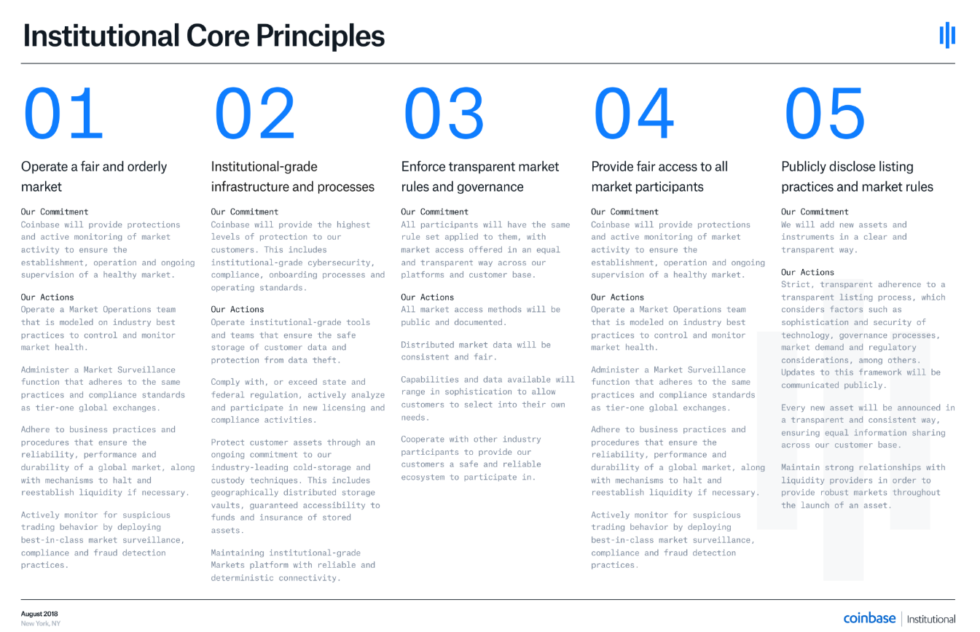 These principles emphasize operating a fair and orderly market, enhancing security to protect its customers, and enforcing transparency. Coinbase also aims to facilitate easy access to the market, while publicly disclosing listing practices and market rules. The chart below details the principles: