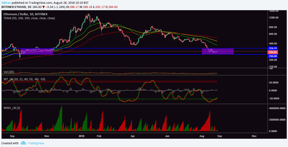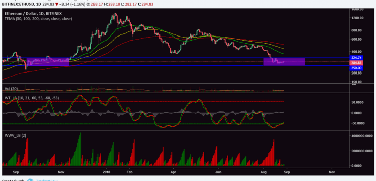 For the past few days, Ethereum (ETH) has maintained its consolidation mode. Wave trend analysis for the above chart shows that the price is likely to continue to consolidate over the course of a few more weeks. WWV indicator on the above chart shows that big bearish momentum that pushed the price down to it bottom before it entered consolidation, is now fading away.