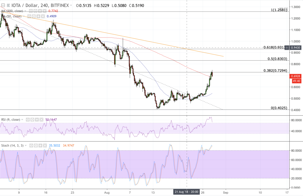The IOT/USD pair on BitFinex is now valued at 0.6922-fiat, almost 50 percent higher than the low recorded on Saturday. Strong fundamentals appear to be the only reason behind the astonishing rally, and technical factors are weighing in precautions by hinting possible bearish corrections in near-term. We sketched a Fibonacci retracement chart on a swing from July’s high at 1.2581-fiat to recent bottom at 0.4025-fiat. As a result, we were able to locate a potential resistance level coinciding with the 38.2 percent level at 0.7274-fiat. Have a look: