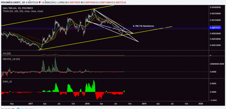 Lisk (LSK) has held its ascending channel so far and the price seems to be poised for a big run up once it breaks the 78.6% fib resistance. As Bitcoin (BTC) risks falling down to $5,800 in the days ahead, it is likely that Lisk (LSK) will hold ground and then move against Bitcoin (BTC) if the altcoin rally is to begin as expected in September. The volume for LSK/BTC is still very low even on large exchanges. This makes it easy to manipulate short term, but long term, Lisk (LSK) will complete its cycle against Bitcoin (BTC) same as other altcoins.