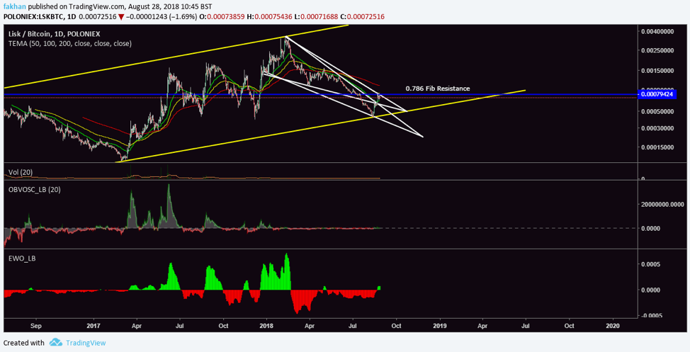 Lisk (LSK) Faces Resistance At 78.6% Fibonacci Against Bitcoin (BTC)