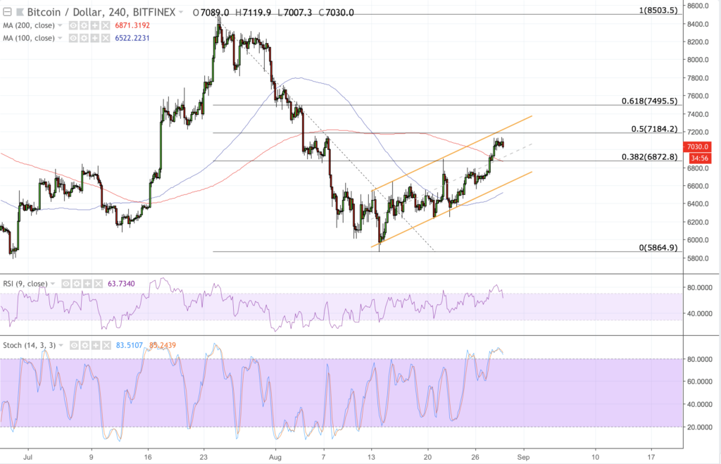 The BTC/USD started Wednesday just shy of 7010-fiat and managed to go as north as 7137-fiat by the end of Asian, and the beginning of European session. The lackluster volume didn’t offer many opportunities for the day traders, but it established that price could attempt a solid breakout from after invalidating its comprehensive narrow range. To explain further, BTC/USD is still climbing inside the ascending channel (please refer to the chart below) while testing its upper trendline as resistance. The pair could attempt a minor pullback before continuing to its current upside rally, which means a break above the channel resistance.