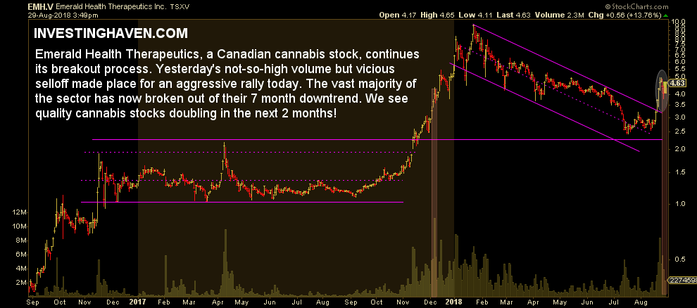 Last week we wrote about the cannabis stock sector, especially about one of the strongest cannabis stocks out there: Emerald Health Therapeutics. We focused on the strong upward potential in 2018: Canadian Cannabis Stock Emerald Therapeutics Will Be A Multibagger In 2018. With the evolution in recent days we tend to believe that a rapid rise in this cannabis stock is unfolding right here right now: Emerald Health Therapeutics may double in the next 2 monhts!