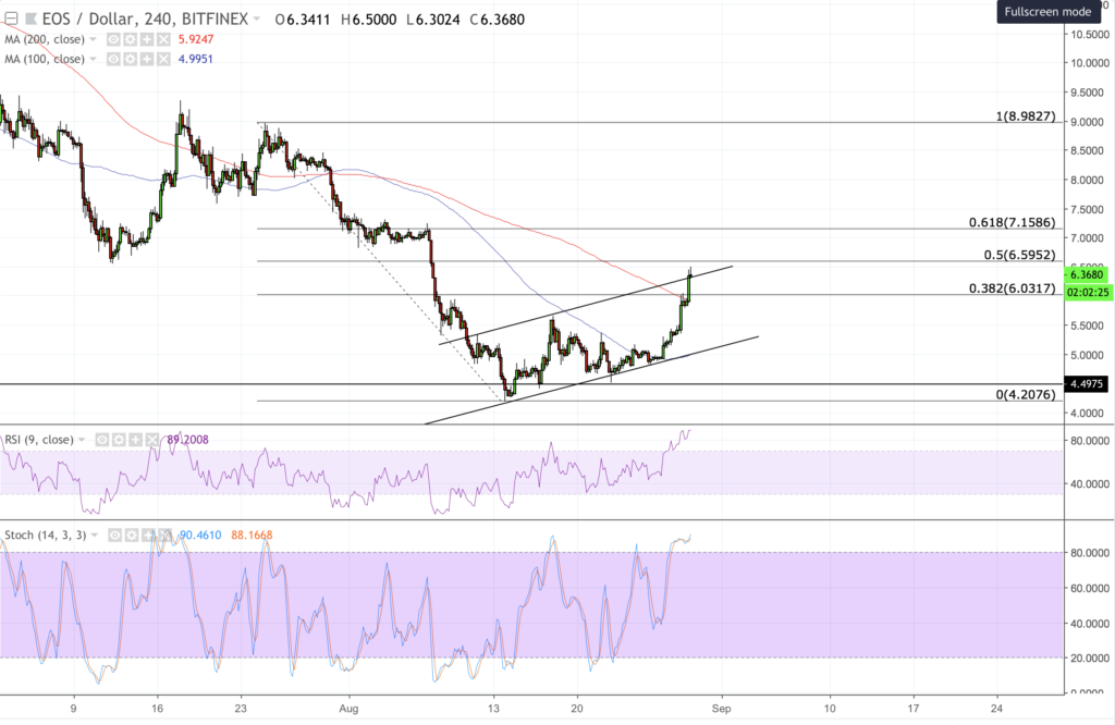 The EOS/USD so far was trading inside an ascending parallel channel, but the latest rally is now pushing the pair above the resistance line. We can see price forming higher highs towards 6.5025-fiat while eyeing a breakout towards the 50% Fibonacci retracement level at 6.5952-fiat of the last leg from 8.9827-high to 4.2076-low. In medium-term, a potential upside is near around the 61.8% Fibonacci of the same leg, also because it would form a reverse Head & Shoulder pattern on shoulder support near 6.0317-fiat and head near 4.2076-fiat, the EOS bottom.