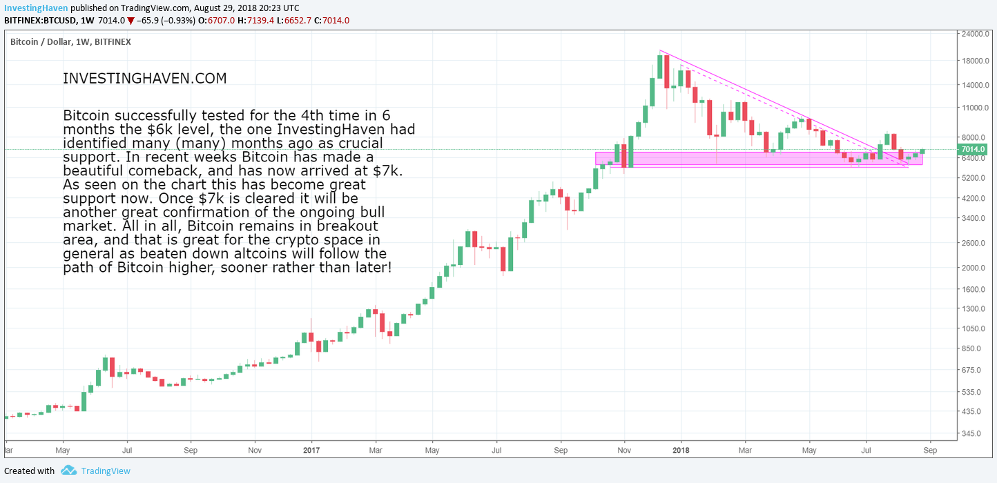 Bitcoin successfully tested $6k for the 4th time in 6 months, and has now arrived at $7k. As seen on the chart this has become great support now. Once $7k is cleared it will be another great confirmation of the ongoing bull market.