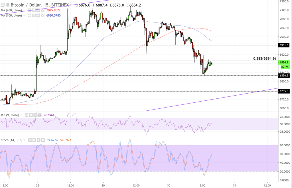 The BTC/USD today continued to its downward trend from the previous high around 7132-fiat. The Asian session kept the price under strict watch, so the pair remained stable. But traders started losing patience at the beginning of European session, during which price formed intraday lows towards 6832-fiat – below the psychological support near 6900-fiat. As we now enter the US trading session, BTC/USD is already attempting a bounce back. Let’s see what’s the sentiment like in the technical analysis section as follows.