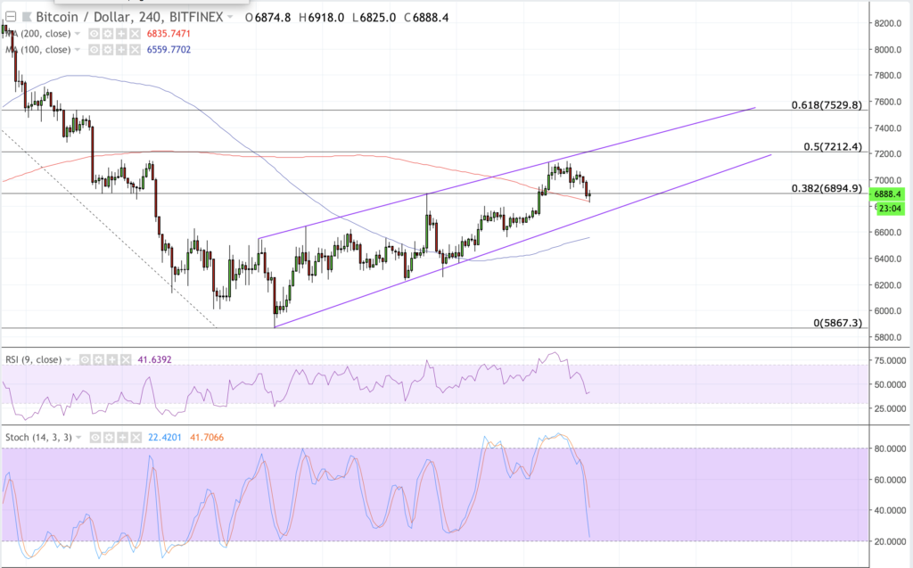 The BTC/USD value in medium-term continues to trend north. In some of our previous analysis, we had discussed a rising wedge channel formation, whose resistance is proving to be accurate during the prevailing steady uptrend. The channel support, meanwhile, is protecting us from a potential breakout to the downside. As of now, we are still inside the rising wedge following a reversal from the level just shy of the channel resistance. The BTC/USD pair is now flirting with 200H MA for an imminent bounce back towards 6900-fiat, followed by the wedge resistance line. At the same time, the pair is above 100H MA by a considerable distance.