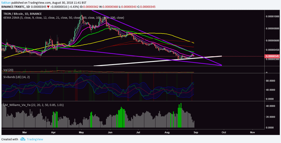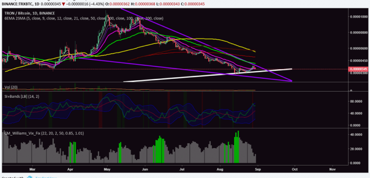 Tron (TRX) has been on a long streak of hibernation. The above daily chart for TRX/BTC shows that Tron (TRX) lost all its rage and thunder when the correction set in. Before that, Tron (TRX) was like favorite son to most crypto investors. However, not many of those investors attempted to show Tron (TRX) any love during the correction as they allowed the price to plunge more than 90% during the past few months. The sentiment on Twitter for Tron (TRX) is more bullish than ever, but buyers are nowhere to be seen.