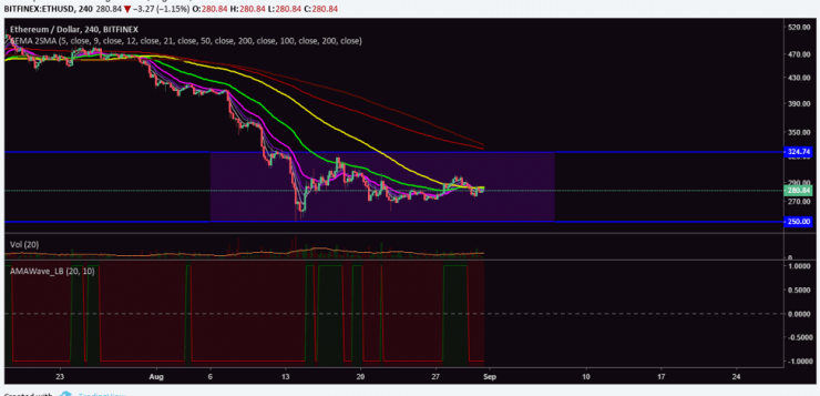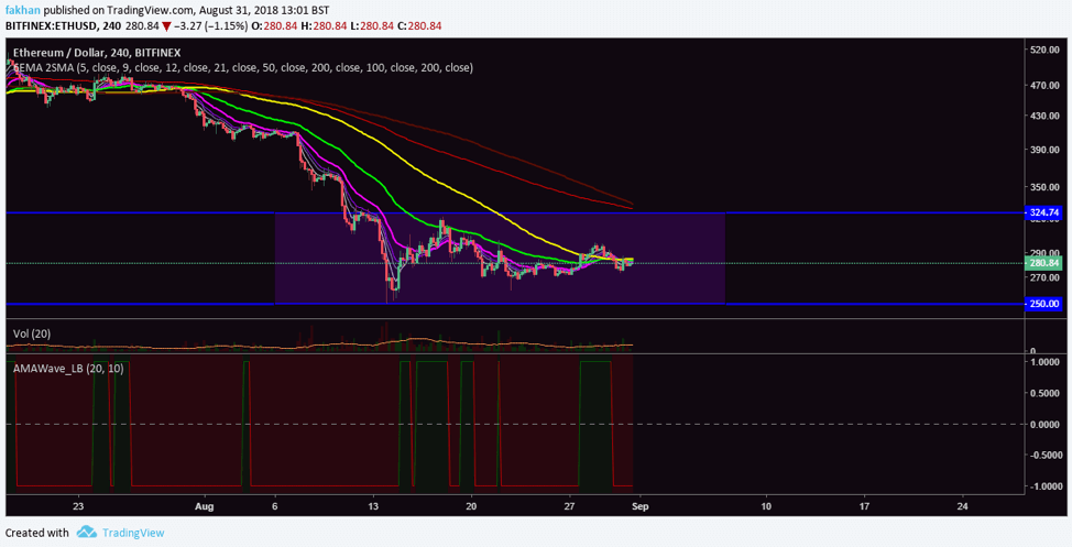The above weekly chart for ETH/USD shows that the price action for Ethereum (ETH) has been a lot more simple and straightforward compared to most cryptocurrencies. This means that the price has just completed a full cycle and is now preparing to exit a phase of consolidation on the weekly time frame. The support at $250 has served to be a critical one for Ethereum (ETH) which the price has held so far. Ethereum (ETH) has been consolidating in a tight range between $324 and $250 on the weekly timeframe. DMACD profile for the above chart shows that this consolidation is about to come to an end even on the weekly time frame and Ethereum (ETH) is all set to begin a new cycle in the weeks ahead.