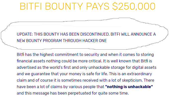 According to CNET, the Bitfi brand has taken a hit on social media and the turnaround is aimed at salvaging its reputation. Bitfi has, however, not indicated whether the bounties it had been offering to security researchers will be awarded to those who hacked its device. Notably, though the US$250,000 bounty program has been discontinued.