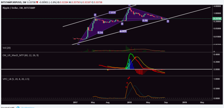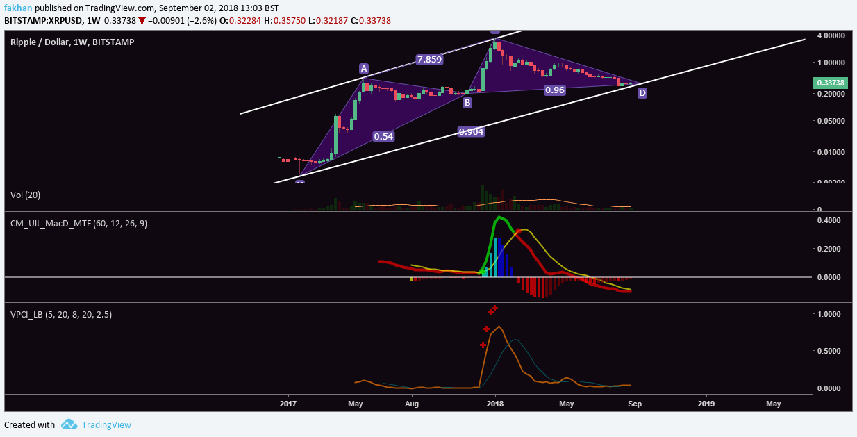Ripple (XRP) is about to begin a new trend. The weekly chart for XRP/USD shows that this could be as soon as next week when Ripple (XRP) forms a new candle outside the bullish gartley formation on the XRP/USD chart. Volume price confirmation indicator for XRP/USD shows the new trend has already started. MACD diagram for the above chart shows that the correction has run its course and Ripple (XRP) is ready to begin a new trend from here. Volume has also been declining steadily and has now reached a point where a break out is expected.